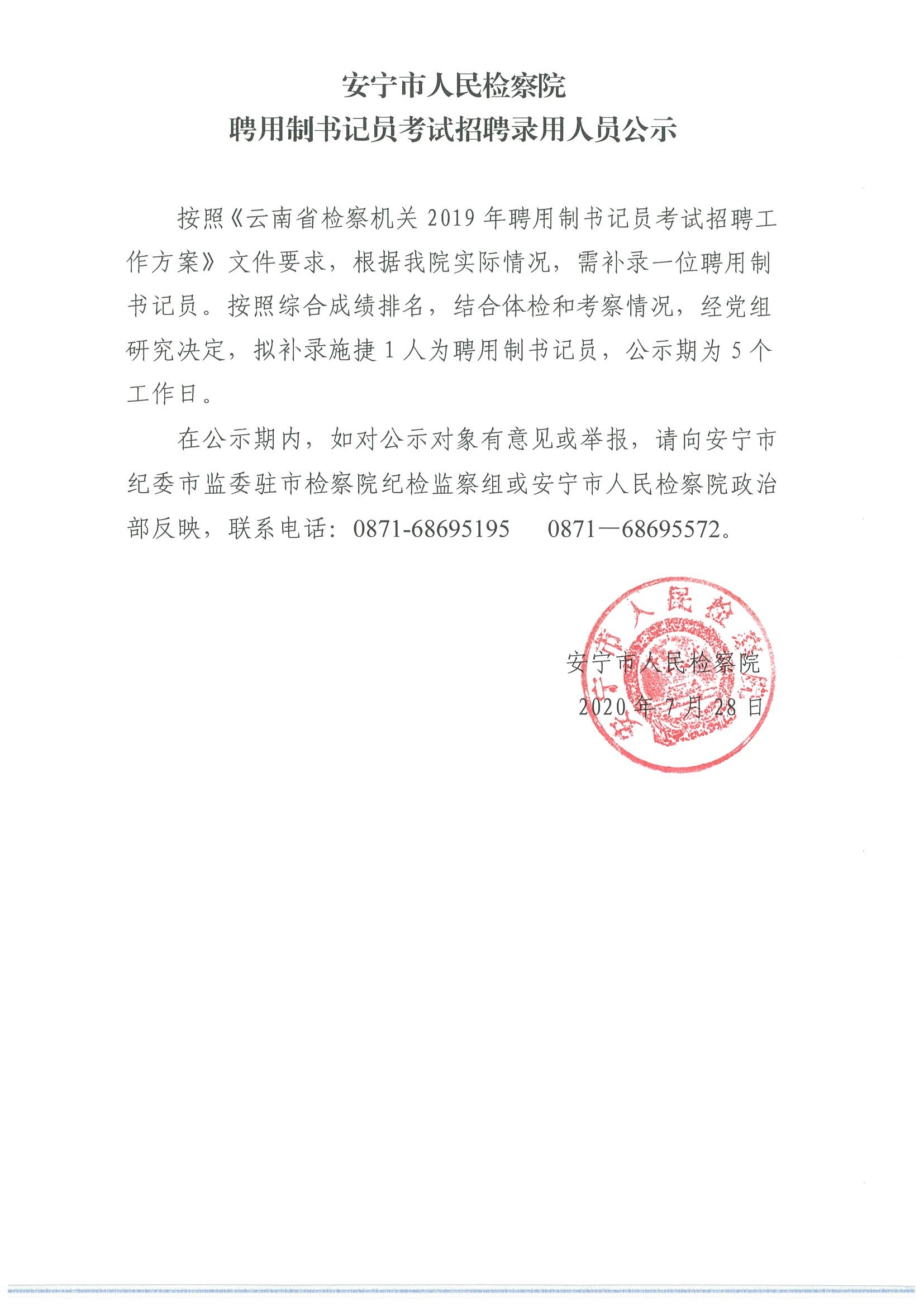 安宁市人民检察院聘用制书记员考试招聘录用人员公示